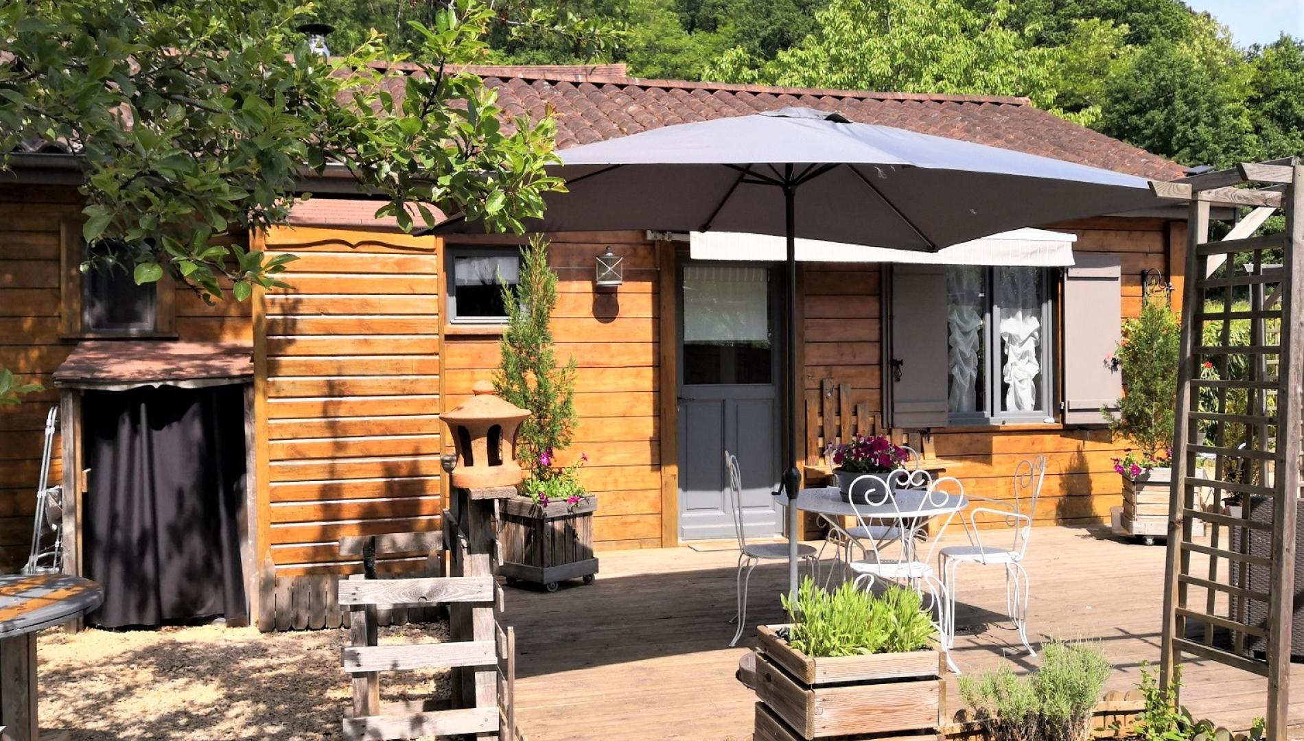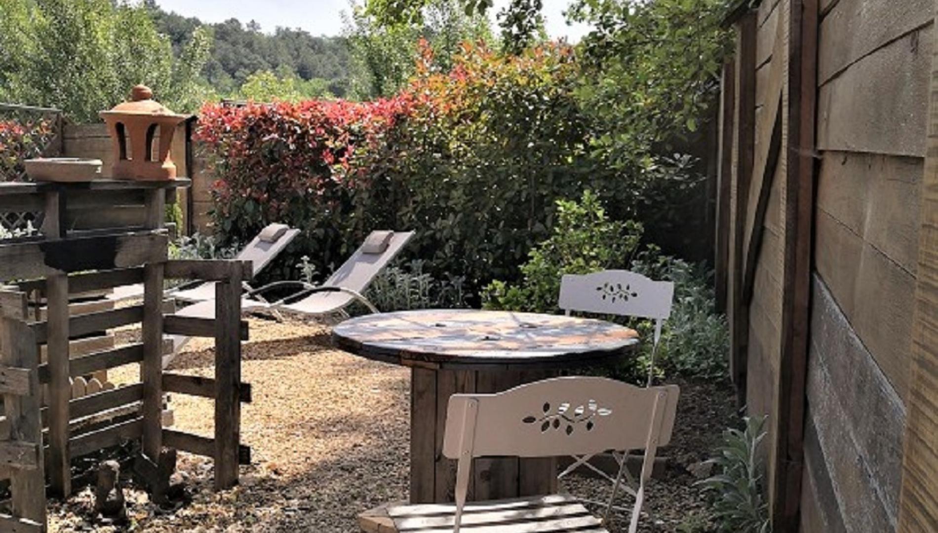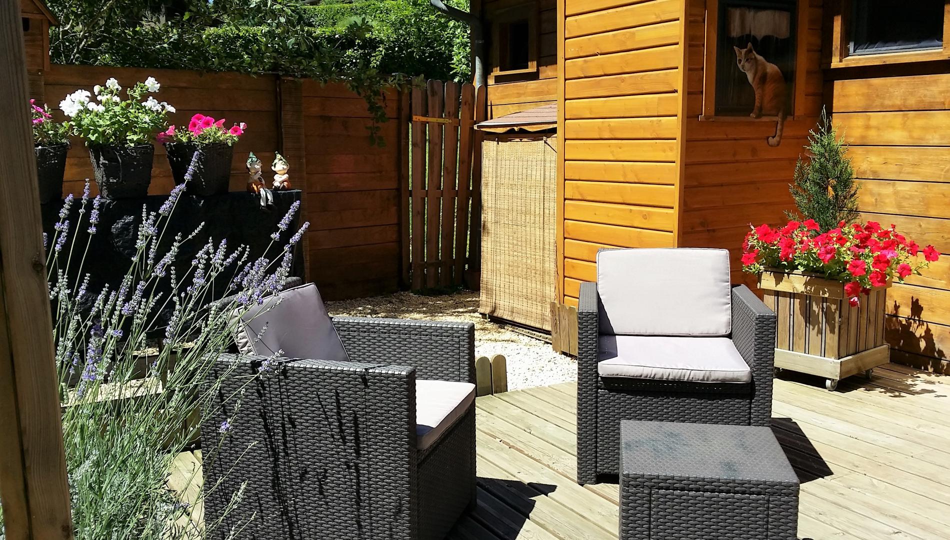- terrasse en bois, de 25 m², équipée d'un salon de jardin, barbecue, 2 relax, salon de détente, , store.