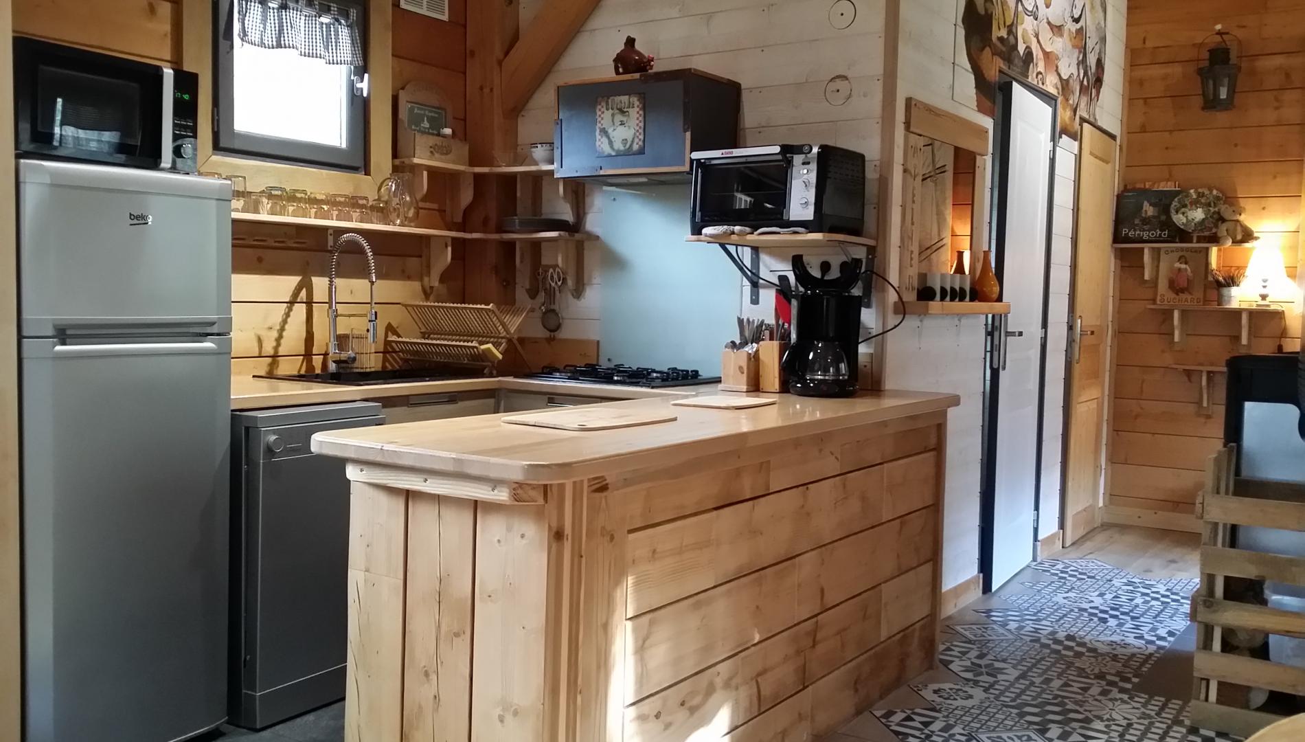 - Cuisine toute équipée : Combiné frigo-congél, Lave-vaisselle, Micro-Ondes. Plaque Gaz, Hotte, Mini four, 2 cafetières, à dosettes et à filtres, Grille-pain, Bouilloire électr, linge de cuisine, torchons.