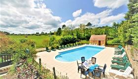 Au coeur du périgord noir , dans un écrin de verdure avec vue sur les chevaux en pature, vous pourrez profiter du calme et de la piscine sur place à partager ;après vos visites et balades ,forêt à proximité , randonnées pédestres fléchées et aussi à proximité tous les sites de la vallée de la Dordogne : Sarlat , Domme , Castelnaut , Beynac , Lascaux .La location comprend 2 chambres , une avec un grand lit et l 'autre avec 3 lits de 90 cm .Vous avez une salle d 'eau avec douche , un WC séparé , une pièce de vie avec cuisine équipée , salon avec canapé et télévision . A l 'avant se trouve une terrasse couverte avec salon de jardin et parasol et à l 'extérieur , vous disposez d'un barbecue à charbon ou à bois .