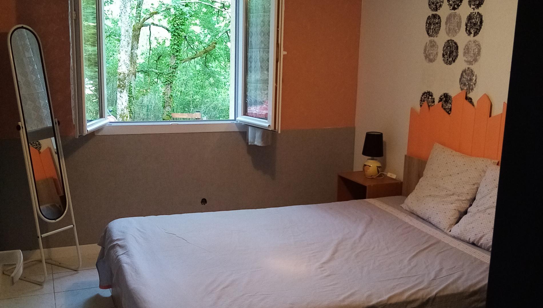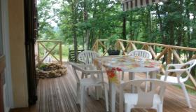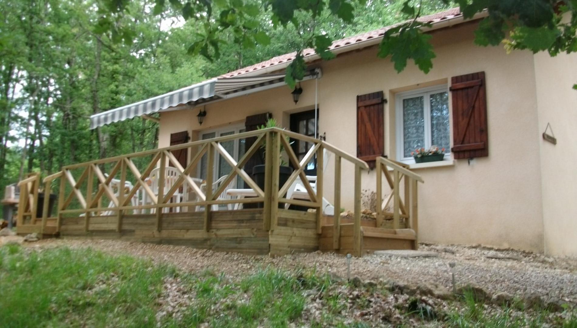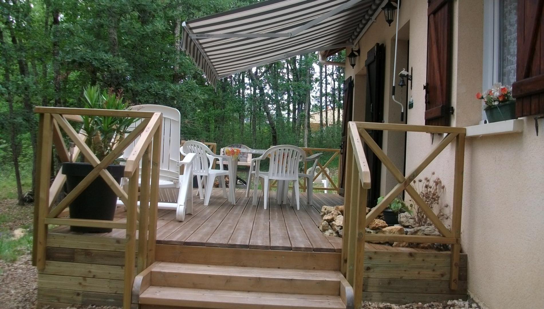 Grand terrain boisé, grande terrasse, salon de jardin, hamac, transat, barbecue en pierre, portique et jeux enfants, parking ombragé.