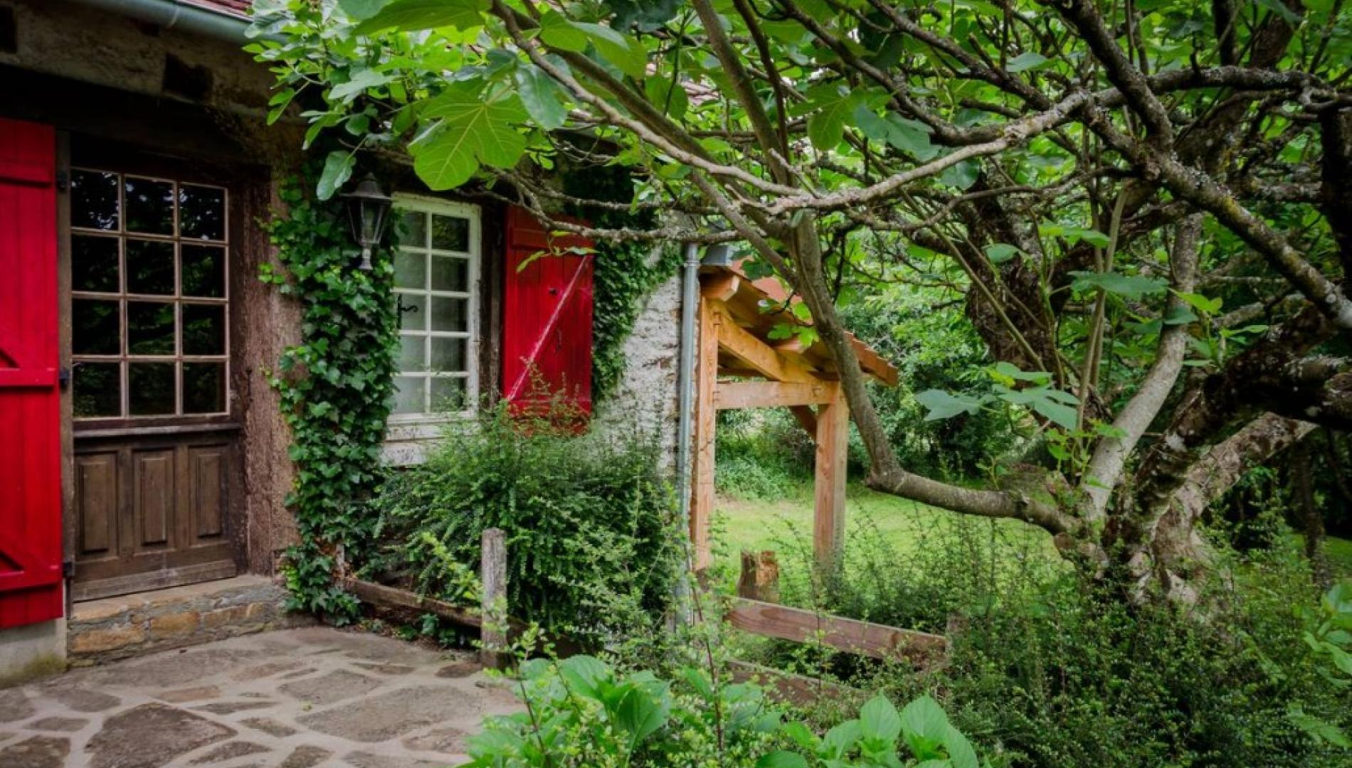 Le salon, orné de son cantou (cheminée locale) avec son poêle à bois, s’ouvre sur une terrasse ombragée de figuiers avec vue sur la piscine.