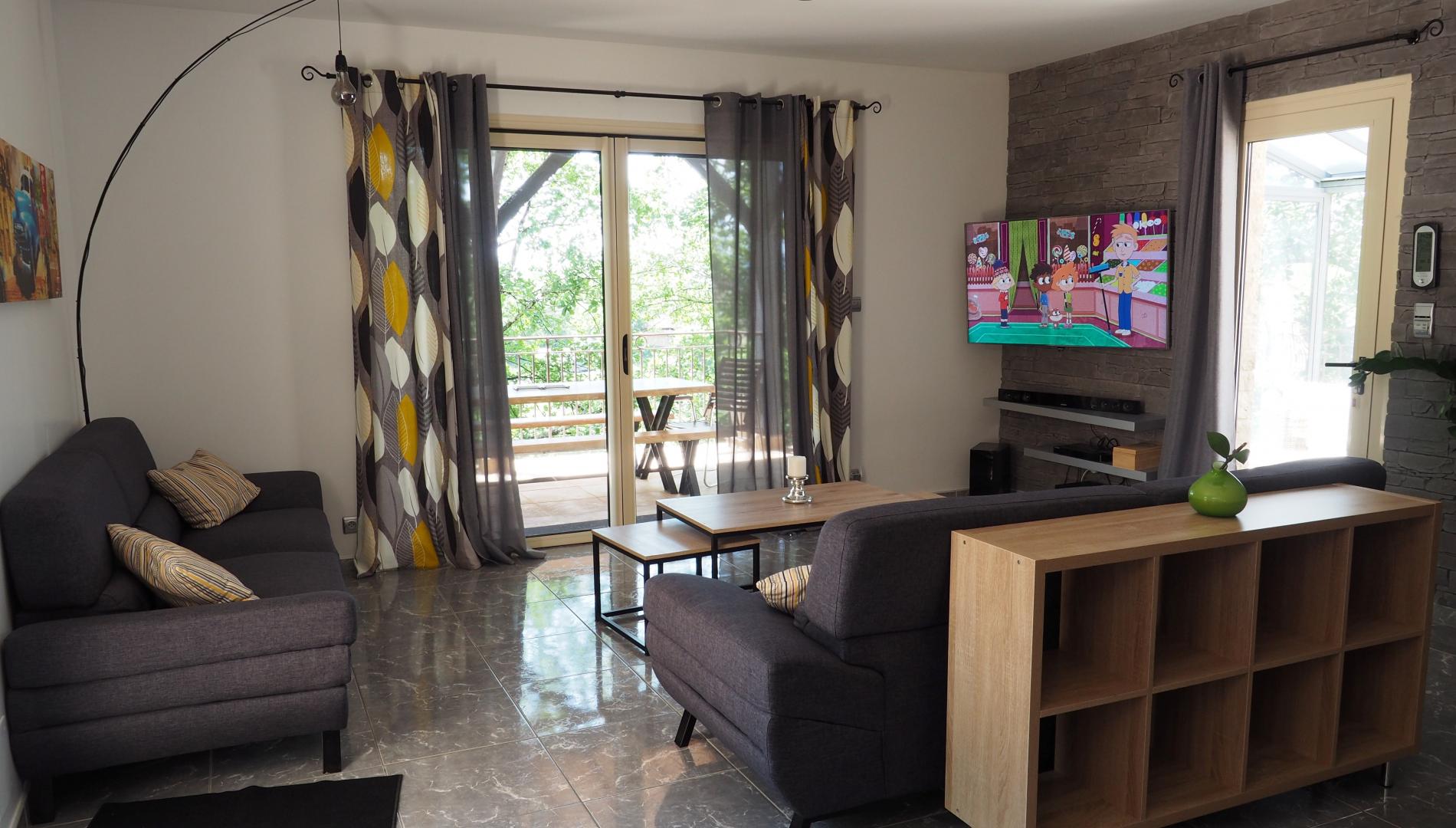 Le coin salon, avec deux canapés, table basse, fauteuils, et grand TV LCD connecté avec home cinéma et lecteur Blu-ray.
