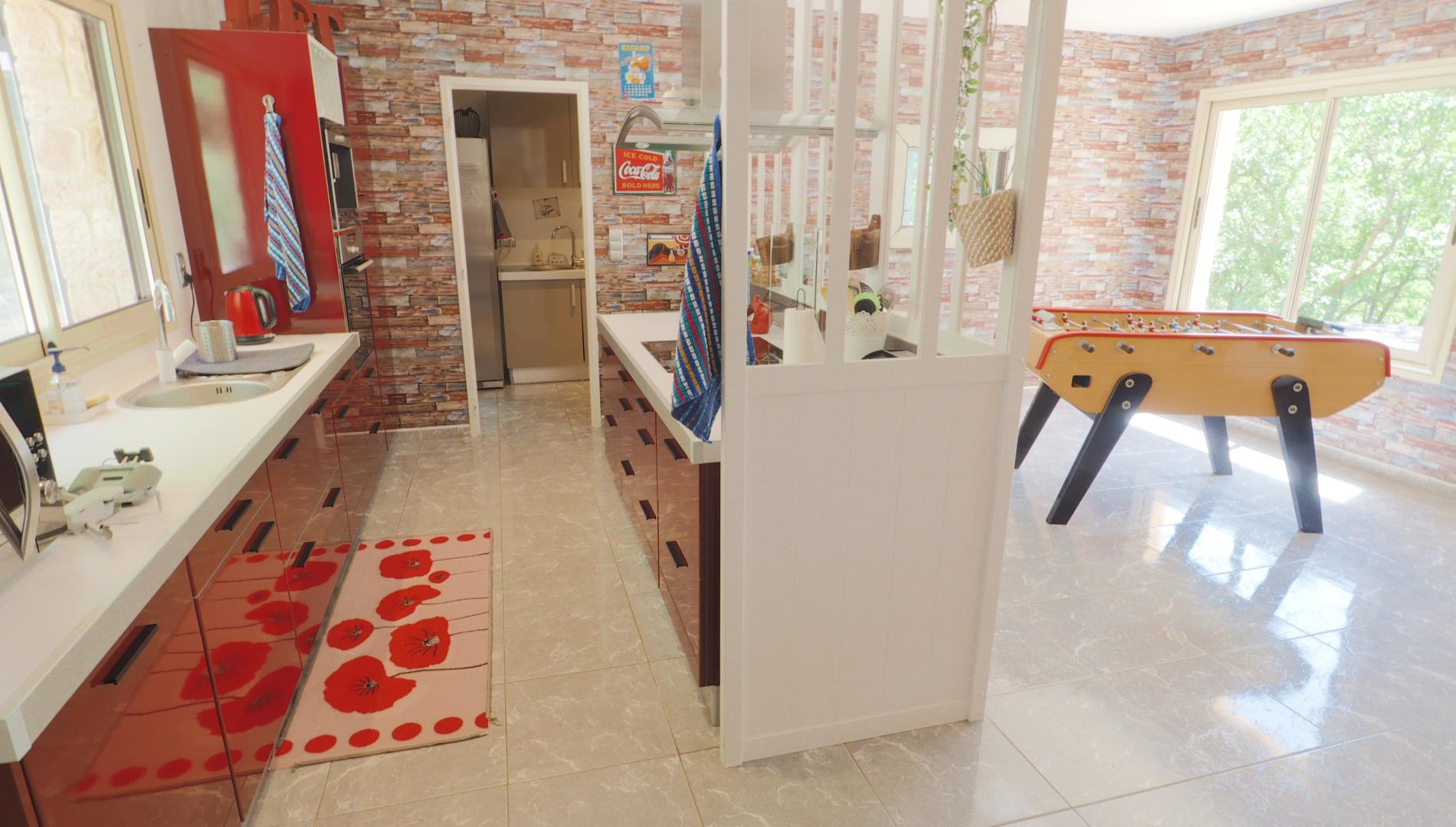 Une spacieuse cuisine et arrière cuisine, toutes équipées (grand frigo, grand congélateur, lave-vaisselle, four, four micro-ondes, table induction, hotte avec groupe externe, cafetière intégrable avec broyeur...) donnant sur une grande pièce à vivre composée d’un espace jeux avec Babyfoot de bar, salon, salle à manger, et accès à la terrasse avant et au patio couvert.