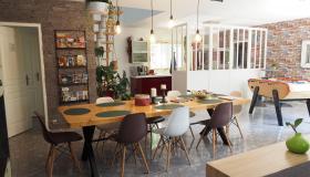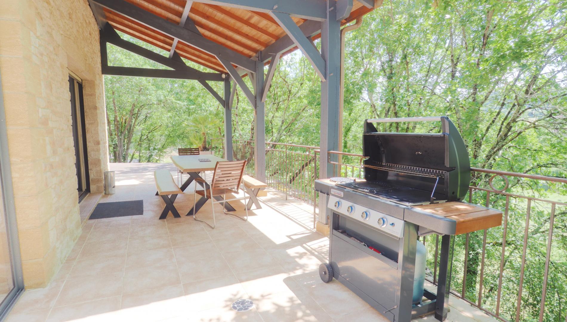 Les portes coulissantes à ouverture totale s'ouvrent sur la terrasse avant couverte avec grande table et barbecue gaz grill et plancha.