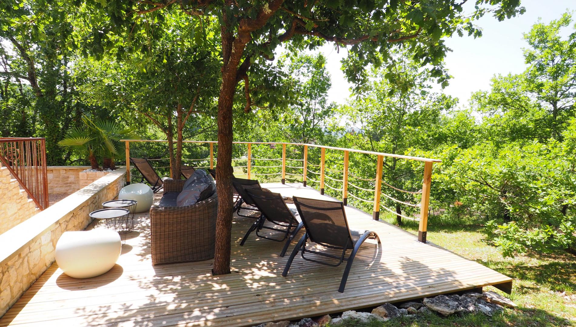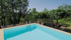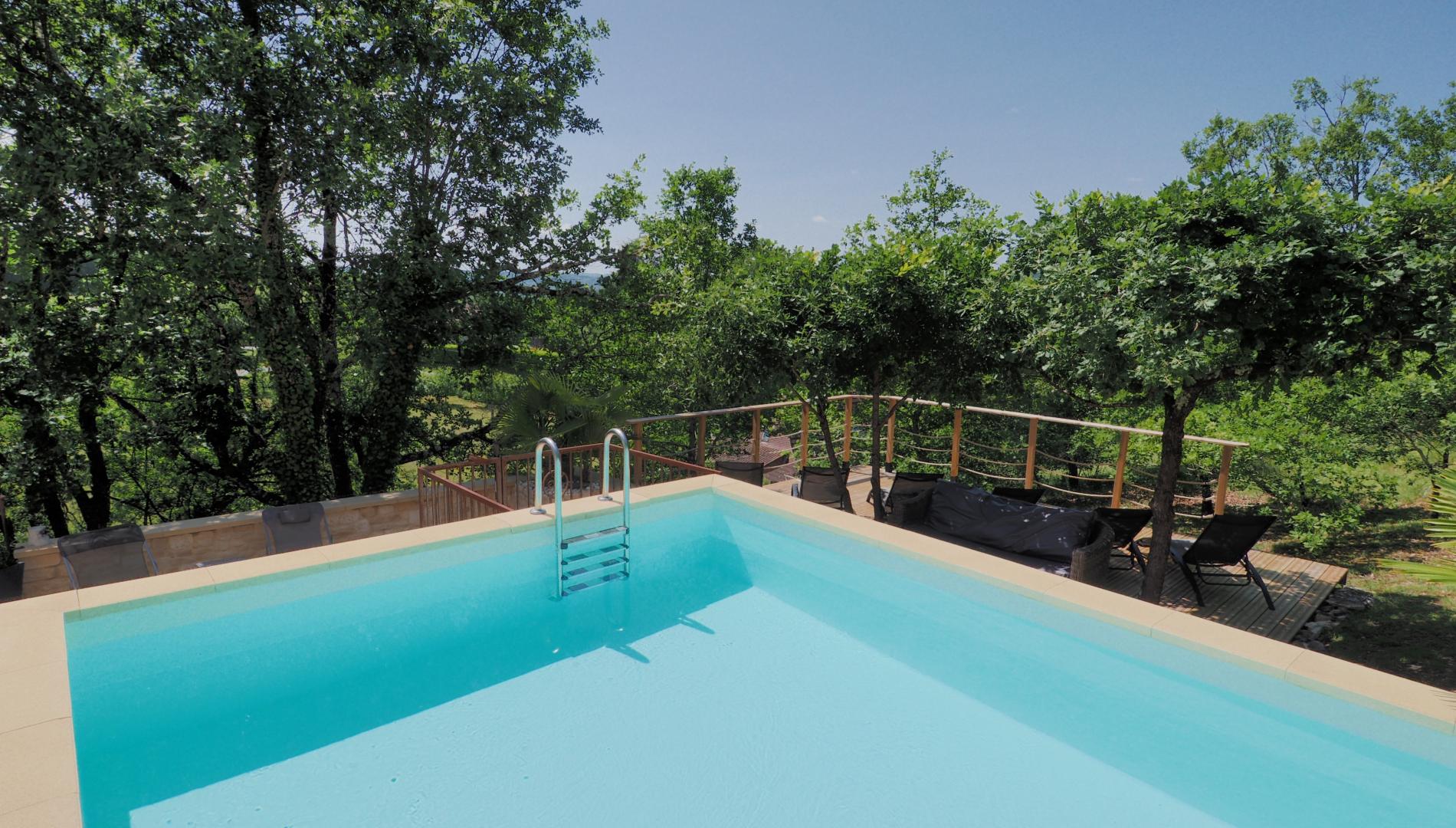 Piscine privée chauffée avec nage à contre-courant, solarium sur terrasse en hauteur équipé de transats et superbe vue sur la vallée. La piscine est sécurisée avec portillon double ouverture, idéale pour une sécurité optimum des plus petits.