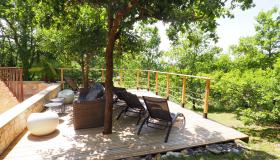 Salon extérieur avec deux canapés, deux fauteuils et table basse.