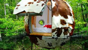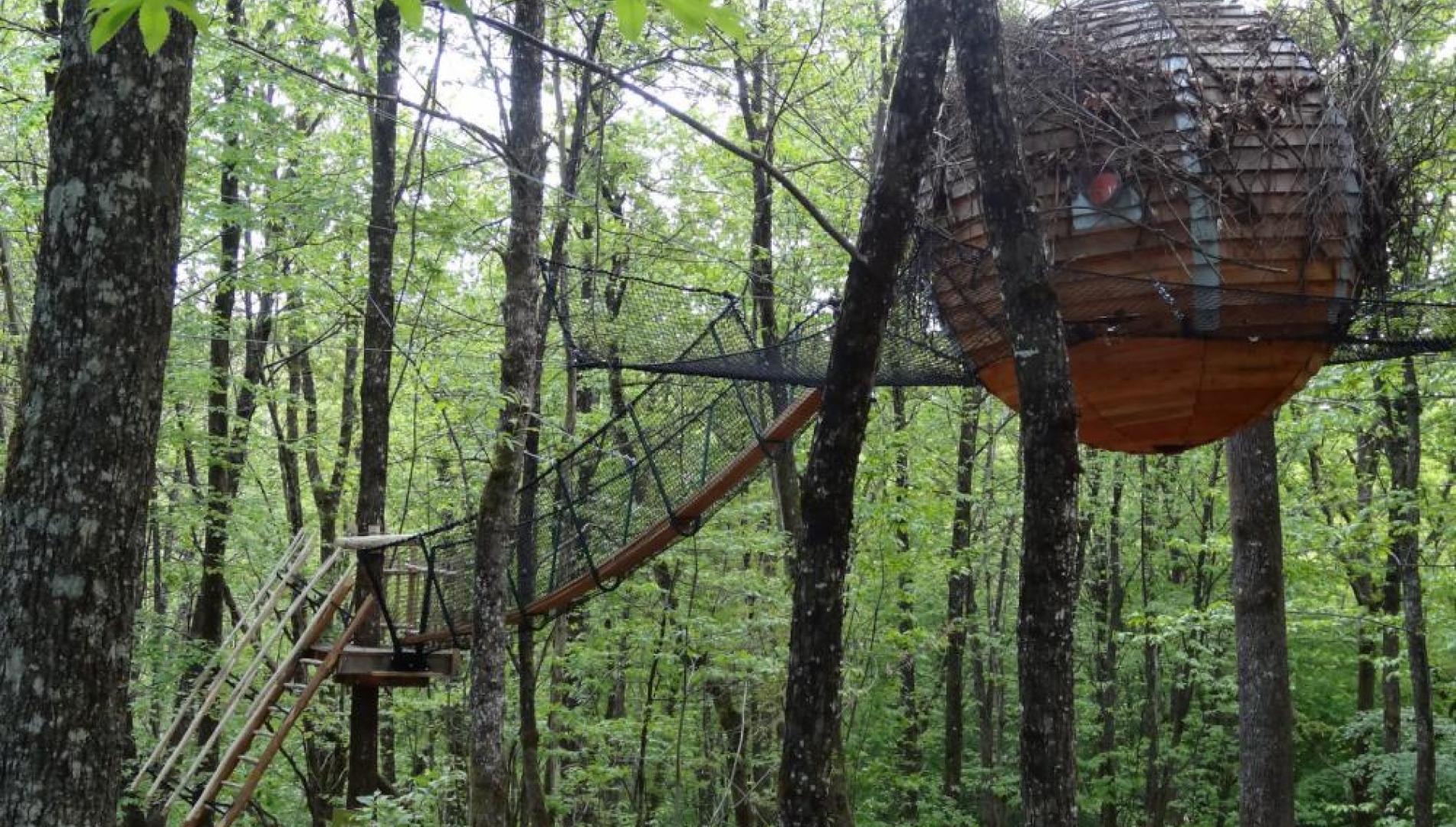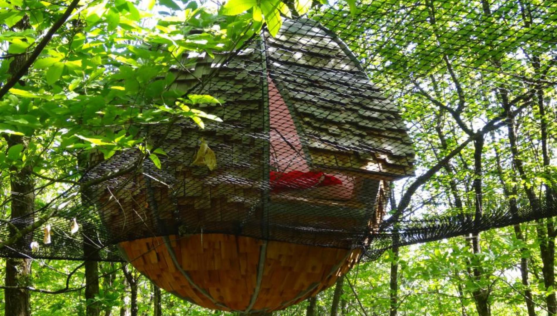 Véritable cocon pour les amoureux, ce lov'nid est entièrement recouvert de bardeaux de bois. Il est suspendu dans les arbres, au coeur d'une forêt préservée, avec un accès par filet et une grande terrasse-hamac pour profiter de la beauté de la nature.