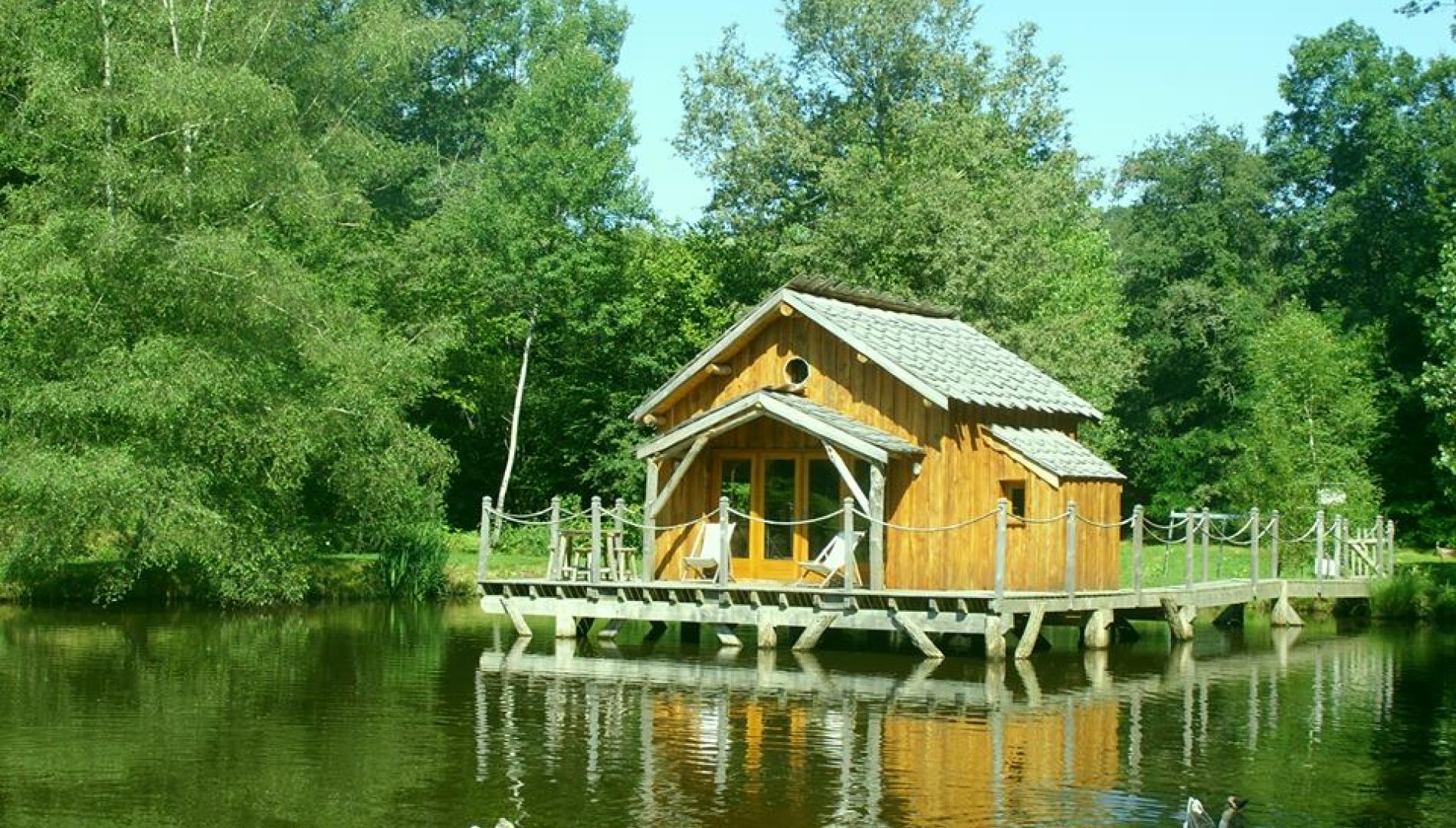 Cabane sur l’eau avec terrasse se prolongeant sur un étang de 2 hectares pour des instants insolites lovés dans le confort d'un intérieur design et chaleureux et le cadre authentique de la nature.